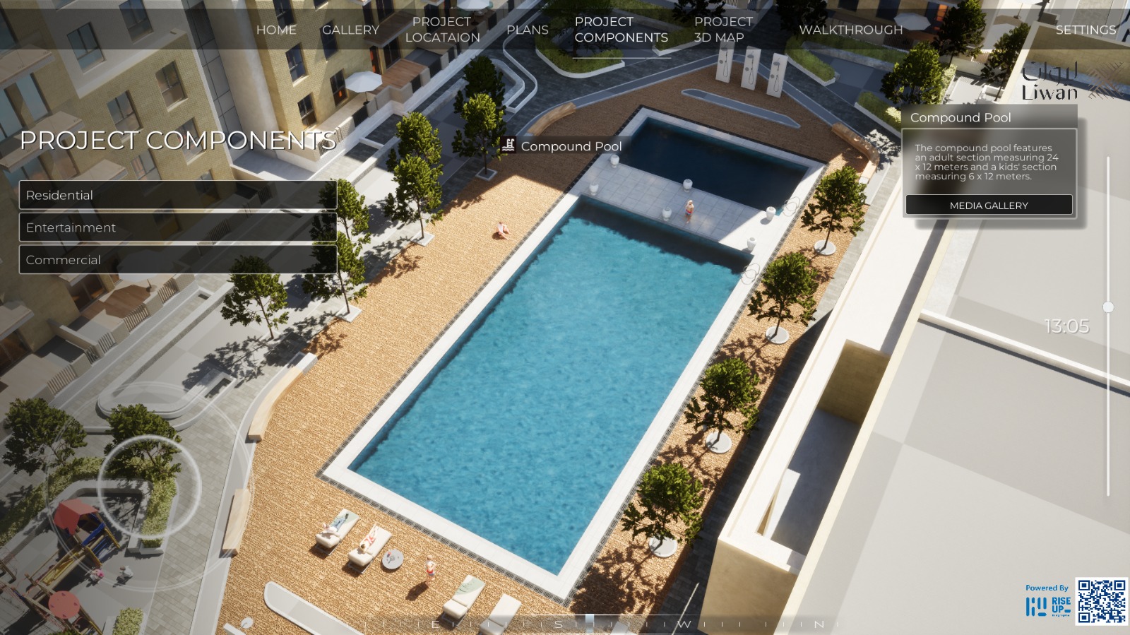 المجسّم التفاعلي أتاح التنقّل بسلاسة بين الوحدات السكنية، المرافق، والخدمات، إضافة إلى استعراض المرافق العامة والمناطق المحيطة، ضمن تجربة استخدام سهلة وغامرة.